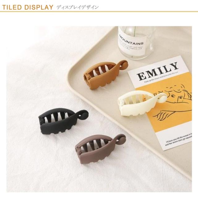 | 大きめで、飾りのない、シンプルなバナナクリップ。 片面2列ずつに、長さが異なる2種類の歯。幅があるので、多めの髪も無理なく挟める! 髪を挟みやすいように、90度に開きます。 | |