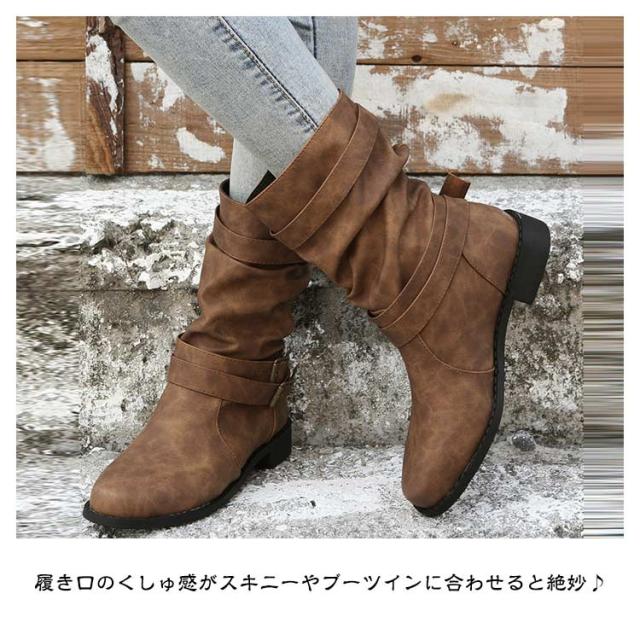 ブーツ ミドルブーツ レディース 靴 ショートブーツ ブーティ 疲れない 歩きやすい エンジニアブーツ くしゅくしゅ ベルト おしゃれ 黒 履き口 ゆったり 大きいサイズ ローヒール 大人かわいい ブラック カジュアル 秋 冬 ブラウン 履きやすい