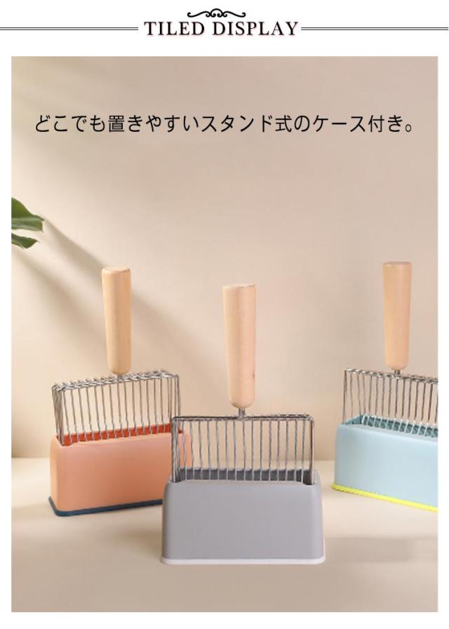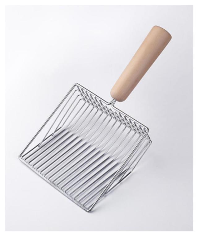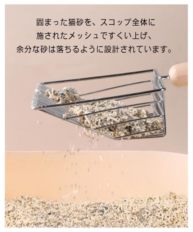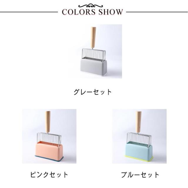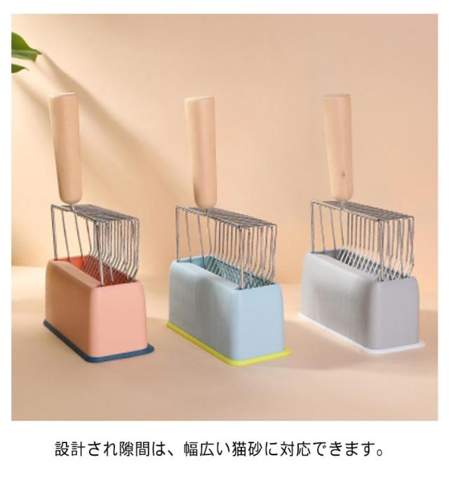 | スタンド型のシンプルなスコップ どこでも置きやすいスタンド式のケース付き。 固まった猫砂を、スコップ全体に施されたメッシュですくい上げ、余分な砂は落ちるように設計されています。 設計され隙間は、幅広い猫砂に対応できます。 シンプルなデザインはトイレ用スコップとして使うものお洒落に。インテリアを邪魔にならないにもうれしいポイント。 | |