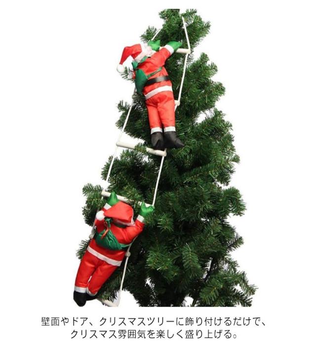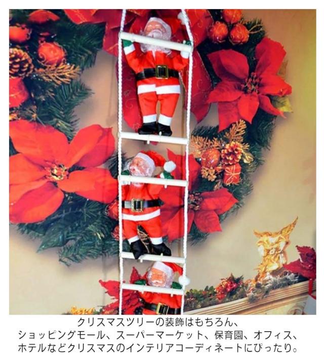 | はしごを登る姿が可愛いサンタクロース人形。 壁面やドア、クリスマスツリーに飾り付けるだけで、クリスマス雰囲気を楽しく盛り上げる。 クリスマスツリーの装飾はもちろん、ショッピングモール、スーパーマーケット、保育園、オフィス、ホテルなどクリスマスのインテリアコーディネートにぴったり。 クリスマスツリーや窓辺に吊るせばプレゼントを持ってきたサンタさんがお家にくると実感したようですね。 | |