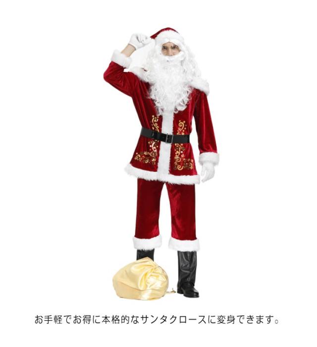 | 高級感のある質の高いサンタクロース衣装。 肉厚の高品質なベルベットを採用し、透けない肌触りよく、通気性も◎上品な光沢感もこだわりです。 裾などには毛足の長いふわふわ、ディテールまでこだわった作り。 サンタ帽子+ケープ+ジャケット+ズボン+ベルト+靴カバー+手袋+髭+白かつらの豪華な9点セット。お手軽でお得に本格的なサンタクロースに変身できます。 おしゃれなサンタ衣装で、クリスマスの仮装、文化祭 忘年会、パーティーやイベントで主役間違いなし。 | |