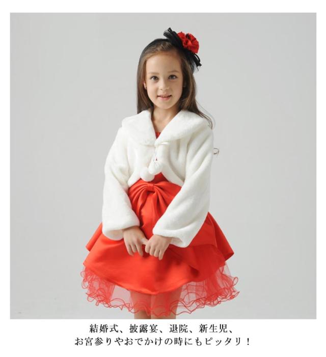 | 定番カラーで色々なドレスやお洋服にも合わせやすい優れものですよ♪ フェイクファー素材仕立ての子供ボレロです。 丈は短いデザインになっているので、ウエストのコサージュやリボンを隠さずドレスの魅力を最大限引き立ててくれます。 結婚式、披露宴、退院、新生児、お宮参りやおでかけの時にもピッタリ! | |