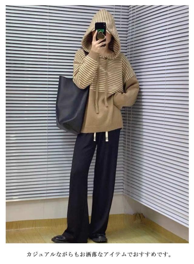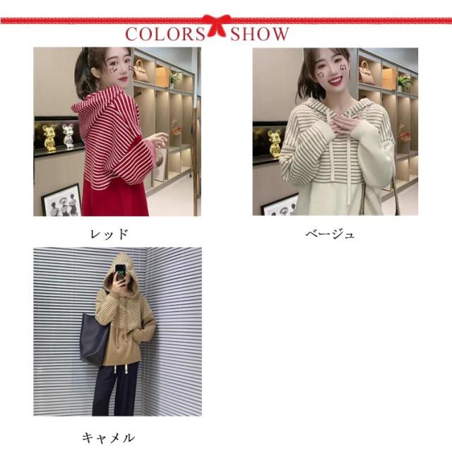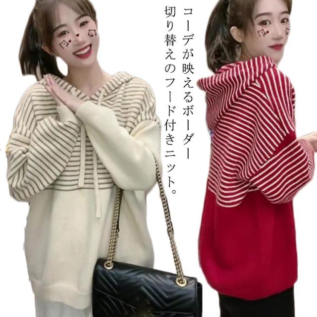 ニット レディース ボーダー 長袖 パーカー フード付き ボーダー柄 切り替え ゆったり カジュアル おしゃれ きれいめ 大人可愛い 大人 着回し 秋 冬 全3色