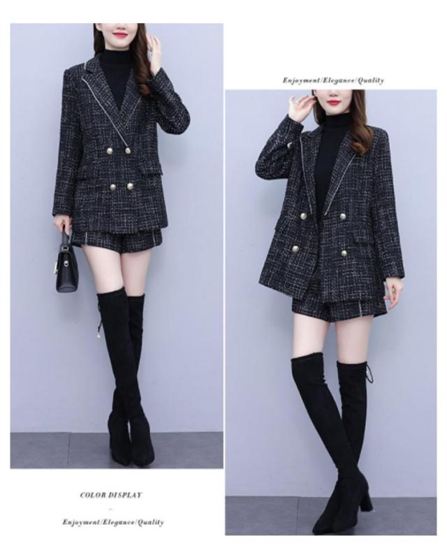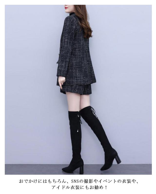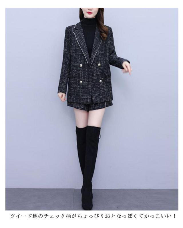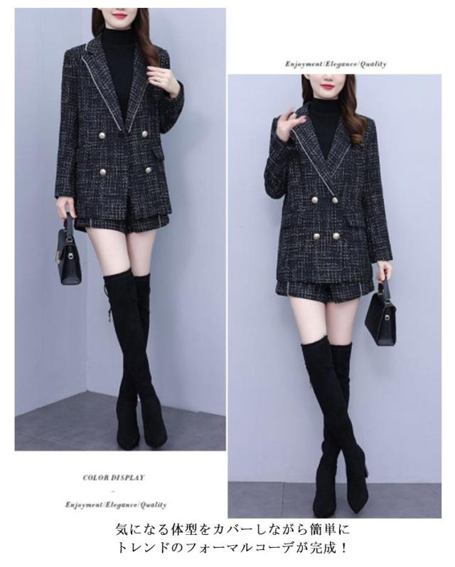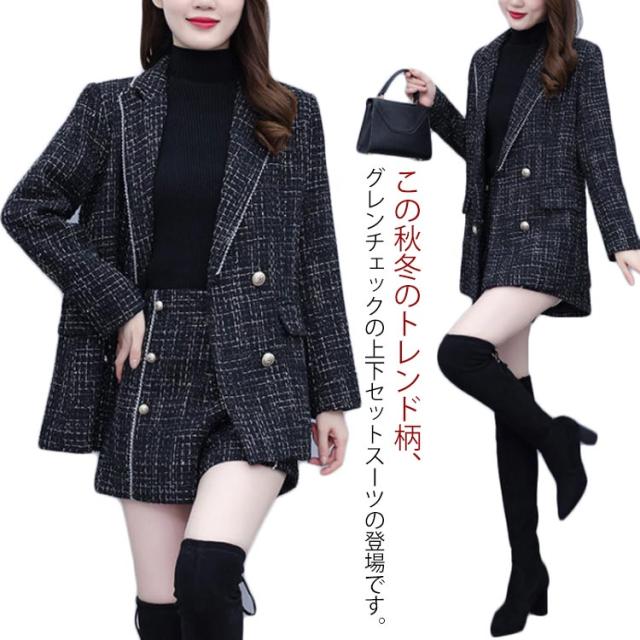 パンツスーツ レディース 上下セット ビジネススーツ テーラードジャケット ツイードジャケット ショートパンツ グレンチェック セレモニースーツ フォーマル セットアップ 入学式 卒業式 オフィス レディーススーツ