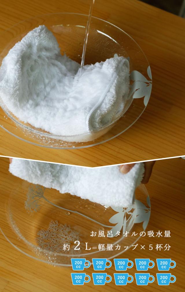 お風呂タオル1枚驚異の約2Lの吸水量、