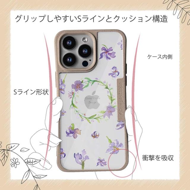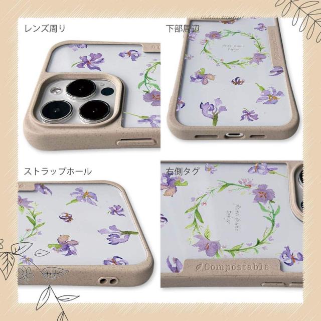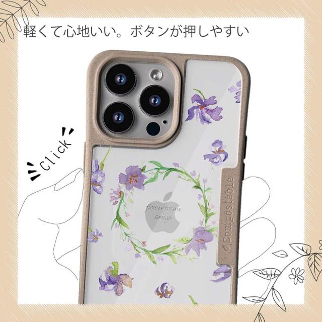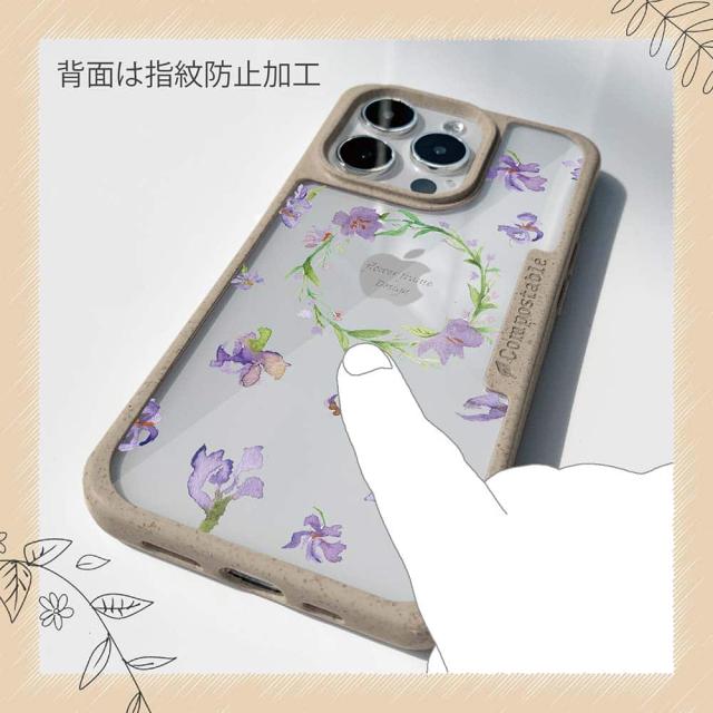 | 注意事項 | コンポスケースは、フレーム部分に「生分解性プラスチック」という環境に優しい素材を使用しております。そのため擦ったり、ぶつけたりする衝撃を与えると脆い部分もあります。耐衝撃ケースではないことをご了承ください。 Qi充電やMagSafe充電にも対応していますが、装着していない時に比べると充電速度は落ちます。 |