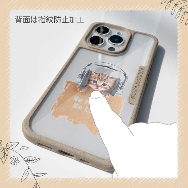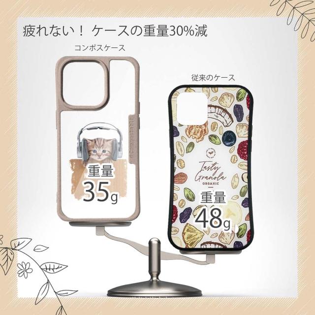 | 注意事項 | コンポスケースは、フレーム部分に「生分解性プラスチック」という環境に優しい素材を使用しております。そのため擦ったり、ぶつけたりする衝撃を与えると脆い部分もあります。耐衝撃ケースではないことをご了承ください。 Qi充電やMagSafe充電にも対応していますが、装着していない時に比べると充電速度は落ちます。 |