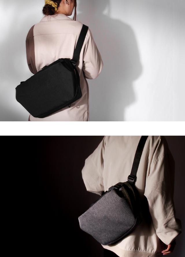 | Riss ECO YARN Black | JAPAN LIMITED cote&cielの代表とされるISARを彷彿とさせる形状で、身体に沿った装着で設計されています。 シャープなサイドシルエットにも関わらず、バックパックの容量・ボディバッグの気軽さを兼ね備えたデザインでカジュアル・ビジネスどちらにも溶け込みます。 背面にはハンドスタイルで使用可能なグリップが配置されており、フックにかける際にも便利です。 デバイスを中央の収納部に下重心でなく、分散されるように収納が出来る為ボディバックのフィット感・メッセンジャーバッグの容量どちらも叶えられます。 サイドのアジャスターベルトによりフラットにもワイドにも仕様が変更可能。 鍵や定期ケースの収納に最適なインナーポケットも魅力的です。 ECO YARNはBlack・Black Melangeの二色展開でJapan Limitedのラインナップ。 |
