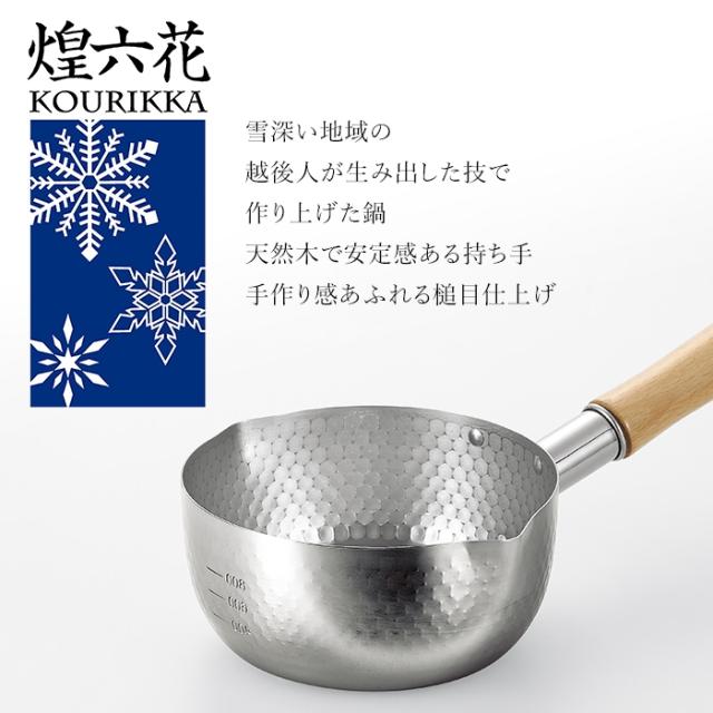 | <煌六花>雪平鍋16cmです。 雪深い地域の越後人が生み出した技で作り上げた鍋。 天然木で安定感ある持ち手になっています。 手作り感あふれる槌目仕上げ。 200V IH、電磁調理器対応。 400ml・600ml・800mlの目盛付きです。 |
