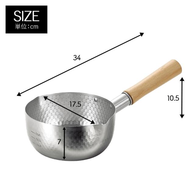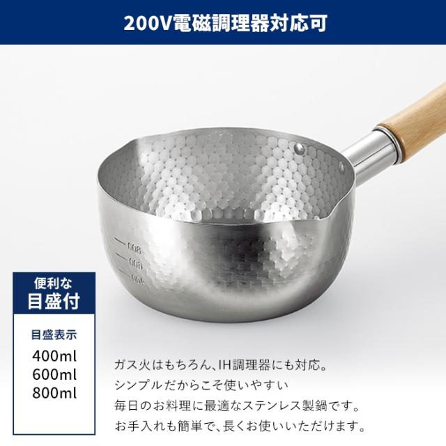 | ◇雪深い地域の越後人が生み出した技で作り上げた鍋。 ◇天然木で安定感ある持ち手。 ◇手作り感あふれる槌目仕上げ。 ◇200V IH、電磁調理器対応。 ◇400ml・600ml・800ml目盛付き。 |