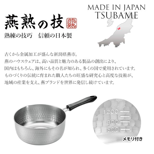 | 熟練の技巧 信頼の日本製 古くから金属加工が盛んな新潟県燕市。 燕のハウスウェアは、高い品質と魅力ある製品の創出により、 国内は勿論、海外にも広くその名が知られ、多くの国で愛用されています。 ものづくりの伝統に育まれた職人たちの旺盛な研究心と高度な技術が、 地域の産業を支え、燕三条を世界に発信し続けています。 ステンレス製のゆきひら鍋は、優れた耐久性と保温性を誇り、野茂の料理やスープ作りなど様々な食材や調理に対応します。 銀色の美しい光沢はキッチンに清潔感と高級感を演出します。 便利で使い勝手の良いステンレス調理道具は美味しさと美しさを引き出し、キッチンを彩ります。 熱効率が良いため調理時間が短縮できます。 中火以下で十分調理が可能な為、光熱費の節約にも役立ちます。 調理準備や調理中に便利な目盛付。 |