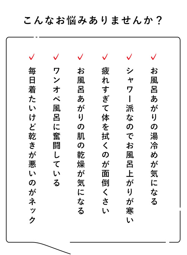 お風呂あがりもバタバタしがちで、気づけば肌は乾燥、体は湯冷め。