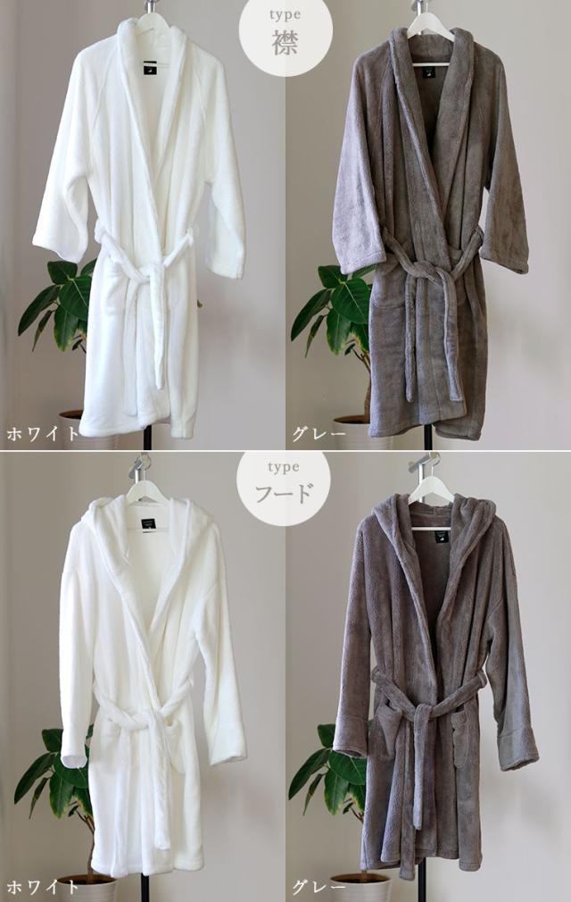 男女兼用のフリーサイズ、襟タイプかフード付き、ホワイトかグレーの4パターンからお選びいただけます。