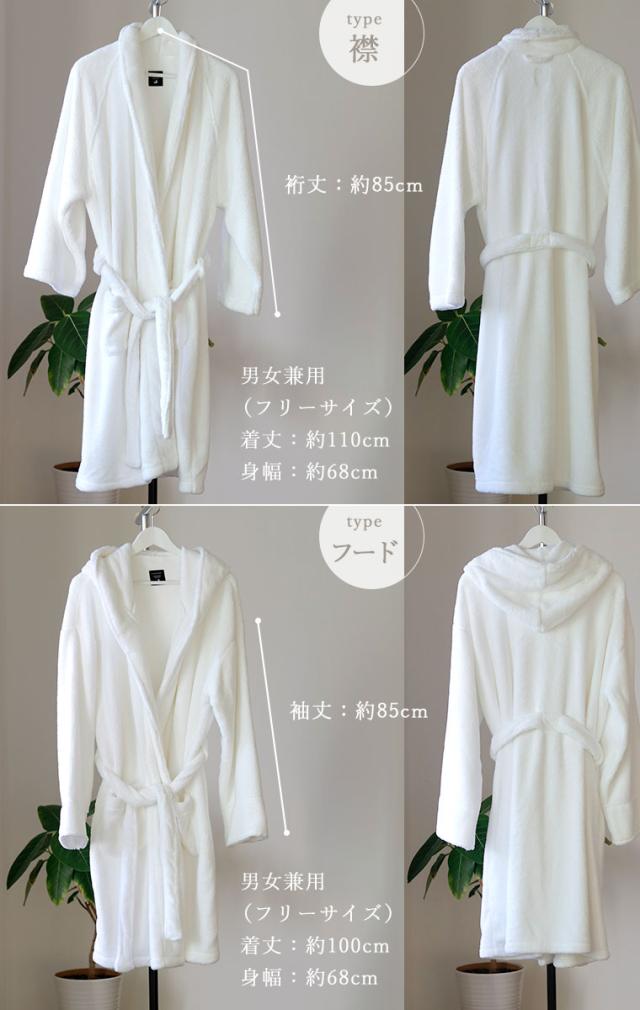 フリーサイズ/男女兼用 [襟タイプ] 着丈:約110cm、裄丈:約85cm、身幅:約68cm ベルト:約180×5cm、ポケット:約5×17.5cm [フードタイプ] 着丈:約100cm、袖丈:約54cm、身幅:約68cm ベルト:約180×5cm、ポケット:約5×17.5cm |