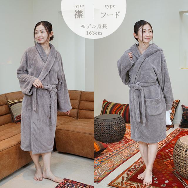 定番のガウン風デザイン(襟タイプ)と、カジュアルなフードタイプ。大きな違いは襟とフードの違いと丈の長さ。