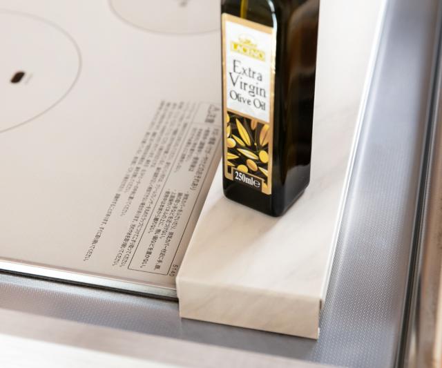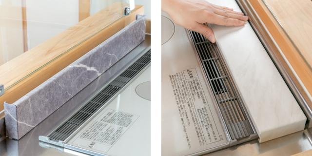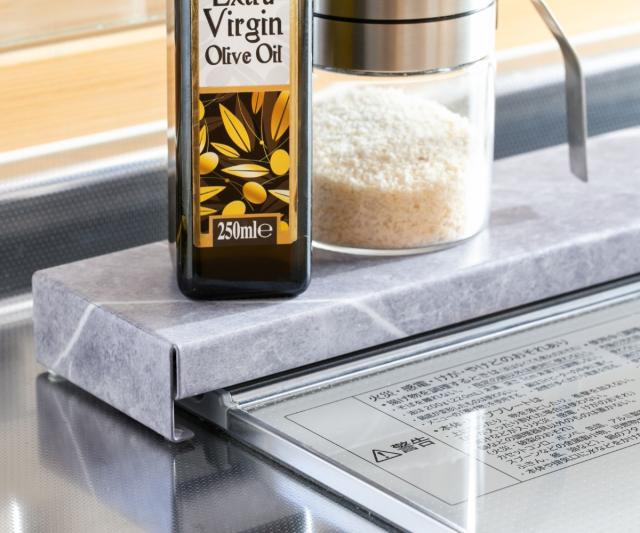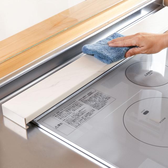 置くだけで、汚れやすく掃除がしにくいグリルの排気口部分に飛び散る油やホコリからしっかりガードします。今まで使わなかったコンロ周りのスペースを有効活用できます。IHにもガスコンロにも対応しています。(※ビルトインコンロ専用)