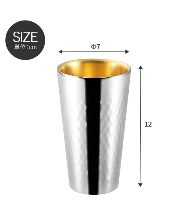 『18-8ステンレス』製の外面には鎚目(ツチメ)模様が入り、内面に金メッキした高級感あるデザインのカップです。
