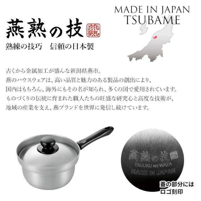 | 熟練の技巧 信頼の日本製 古くから金属加工が盛んな新潟県燕市。 燕のハウスウェアは、高い品質と魅力ある製品の創出により、 国内は勿論、海外にも広くその名が知られ、多くの国で愛用されています。 ものづくりの伝統に育まれた職人たちの旺盛な研究心と高度な技術が、 地域の産業を支え、燕三条を世界に発信し続けています。 ステンレス製の片手鍋は、優れた耐久性と保温性を誇り、野茂の料理やスープ作りなど様々な食材や調理に対応します。 銀色の美しい光沢はキッチンに清潔感と高級感を演出します。 便利で使い勝手の良いステンレス調理道具は美味しさと美しさを引き出し、キッチンを彩ります。 鍋の丸いフォルムによりふきこぼれを抑える対流へつながる効果があり、調理がしやすい製品となっております。 熱効率が良いため調理時間が短縮できます。 中火以下で十分調理が可能な為、光熱費の節約にも役立ちます。 蓋の部分には金物の町、燕三条製品と日本製のロゴ刻印があります。 |