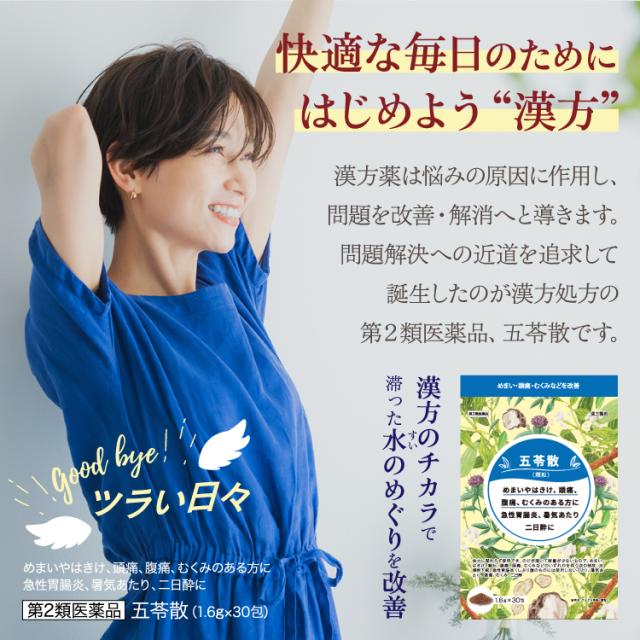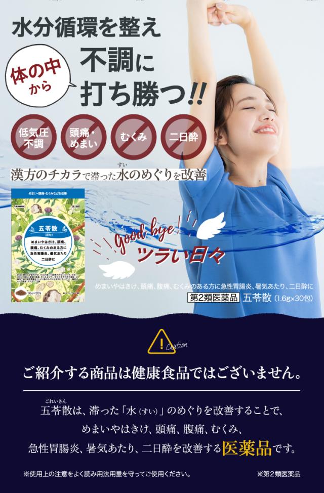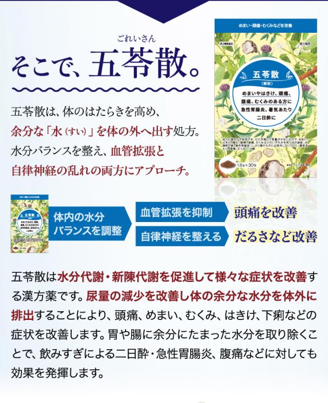 めまいや吐き気、水溶性下痢、急性胃腸炎、暑気あたり、頭痛、むくみ、二日酔いに効く漢方製剤