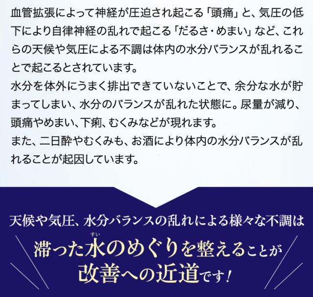 てんぐ五苓散(顆粒)は、5種の生薬末を配合した顆粒剤で、頭痛、めまい、むくみ、はきけ、暑気あたりなどに効果のある漢方薬です。漢方では、これらの症状を“水毒”といって、体内の水分代謝の乱れによっておこると考えます。五苓散は体内の余分な水分を排出し、水分バランスを正常に整えることで水毒症状を改善します。