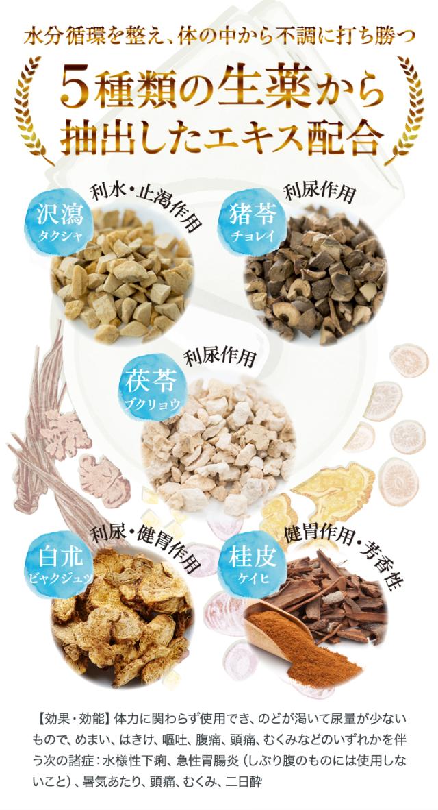 タクシャ末 1.40625g、ブクリョウ末 0.84375g、ビャクジュツ末 0.84375g、ケイヒ末 0.5625g、チョレイ末 0.84375g