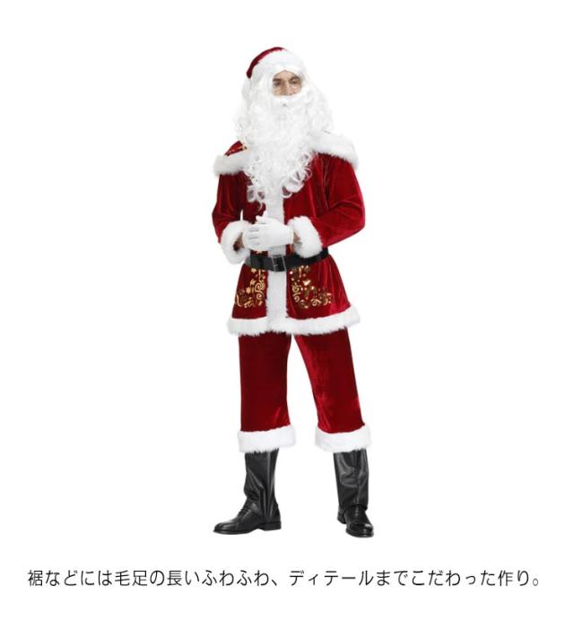 | 高級感のある質の高いサンタクロース衣装。 肉厚の高品質なベルベットを採用し、透けない肌触りよく、通気性も◎上品な光沢感もこだわりです。 裾などには毛足の長いふわふわ、ディテールまでこだわった作り。 サンタ帽子+ケープ+ジャケット+ズボン+ベルト+靴カバー+手袋+髭+白かつらの豪華な9点セット。お手軽でお得に本格的なサンタクロースに変身できます。 おしゃれなサンタ衣装で、クリスマスの仮装、文化祭 忘年会、パーティーやイベントで主役間違いなし。 | |