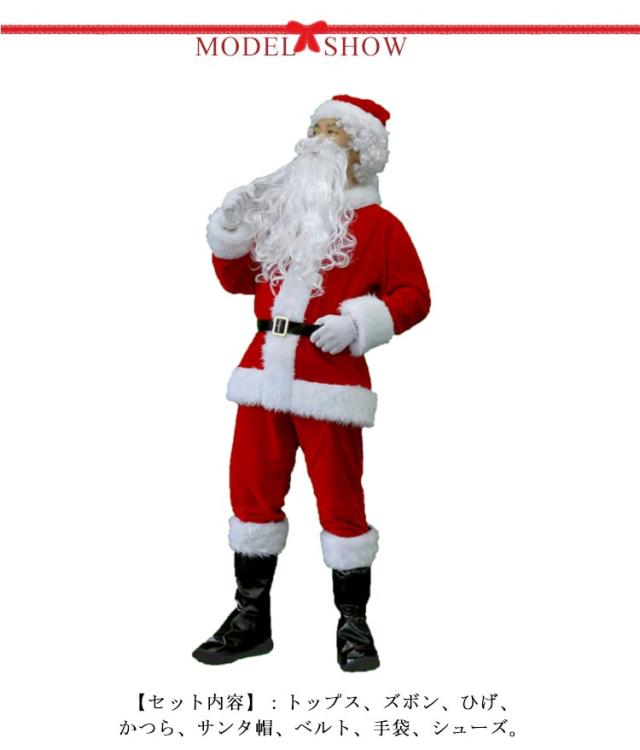 | サイズについての説明 | セット内容:トップス、ズボン、ひげ、かつら、サンタ帽、ベルト、手袋、シューズ。 【M】着丈67cm バスト106cm 肩幅49cm 袖丈58cm ズボン長さ99cm ウエスト86cm 【L】着丈68cm バスト110cm 肩幅50cm 袖丈59cm ズボン長さ100cm ウエスト90cm 【XL】着丈69cm バスト114cm 肩幅51cm 袖丈60cm ズボン長さ101cm ウエスト94cm |