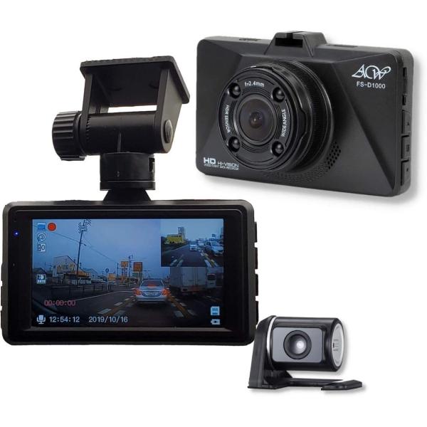 送料無料!前後 2カメラ ハイビジョンドライブレコーダー FS-D1000 録画中ステッカー付 HDR Gセンサー 赤外線搭載 広角 動体検知 電波干渉対策済
