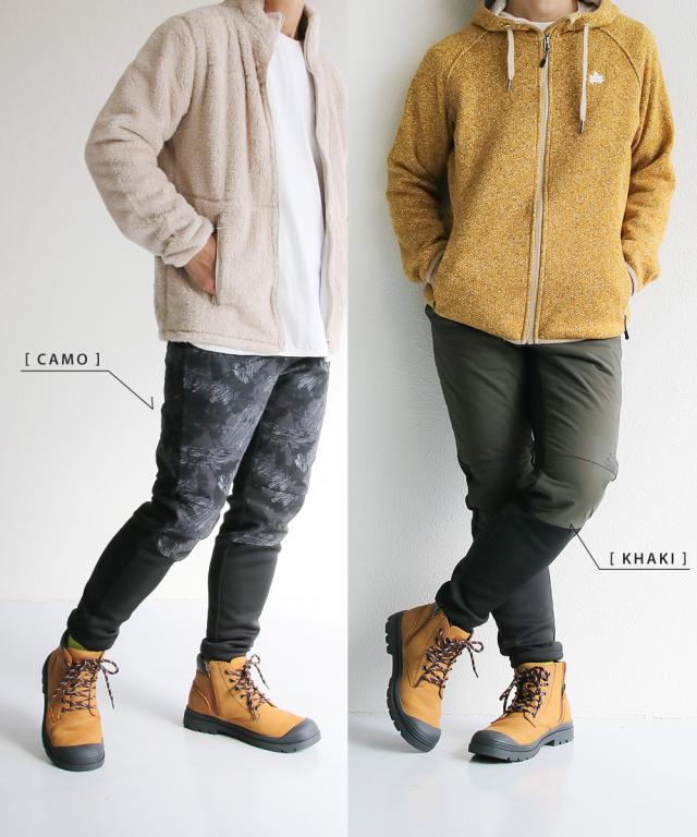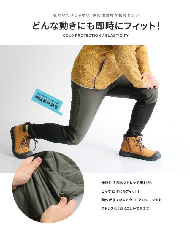 膝上には中綿素材、膝下からは伸縮性のある裏フリースジャージー素材となっており動きやすさを確保しつつ暖かな穿き心地を実現。