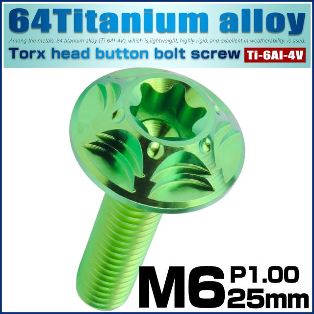 チタンボルト M6×25mm P1.0 ボタンボルト フランジ付き トルクス穴 グリーン JA1383