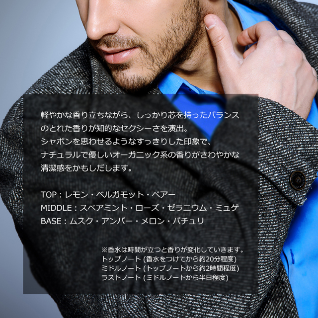 「男をアゲる DAY TIME」時間帯で使い分けるだけでなく、重ね付けで貴男だけの第三の香りを創る『PILE UP』もお楽しみください。比率を変えたり、時間差で重ね付けしたり...消臭サポートで人気の 『パンシル(R)』 配合。主成分は柿渋(カキタンニン)、原料が柿なので安心して使用できます。