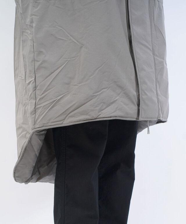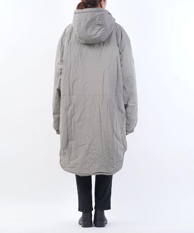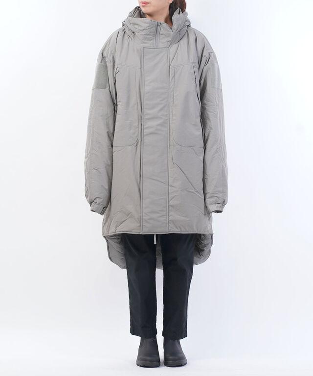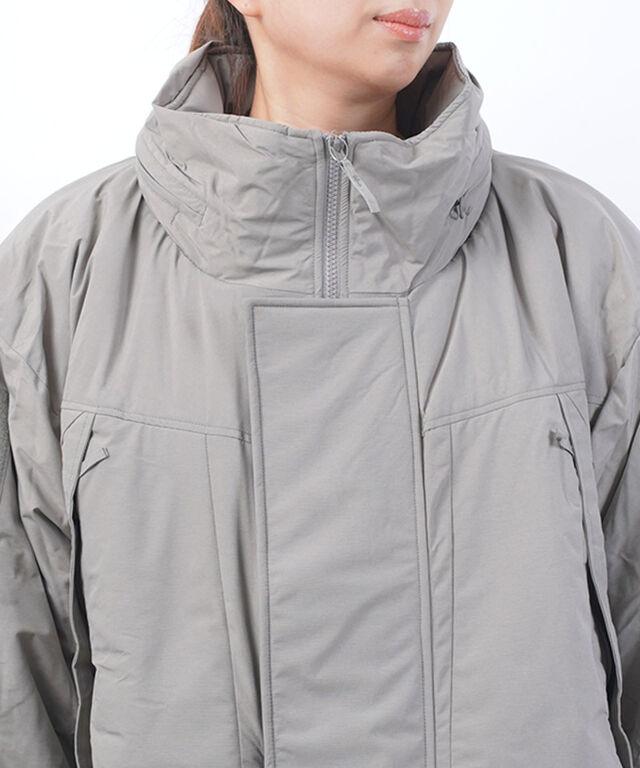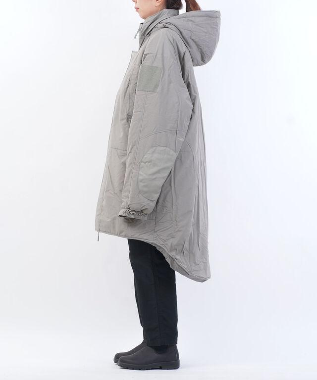 装備の上から羽織れるように非常に大きな作りの中綿コート。