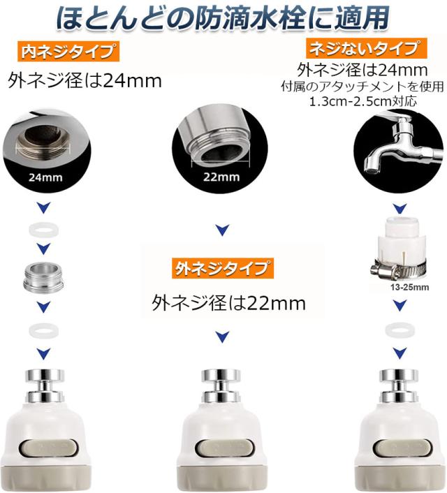 【幅の広い対応性】ほとんどの防滴水栓に適用します。外ネジタイプ、内ねじタイプ、万能アタッチメント付属なのでネジがないタイプも対応(1.4cmから2.3cmまで)可能です。