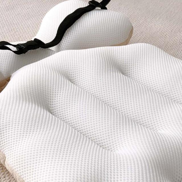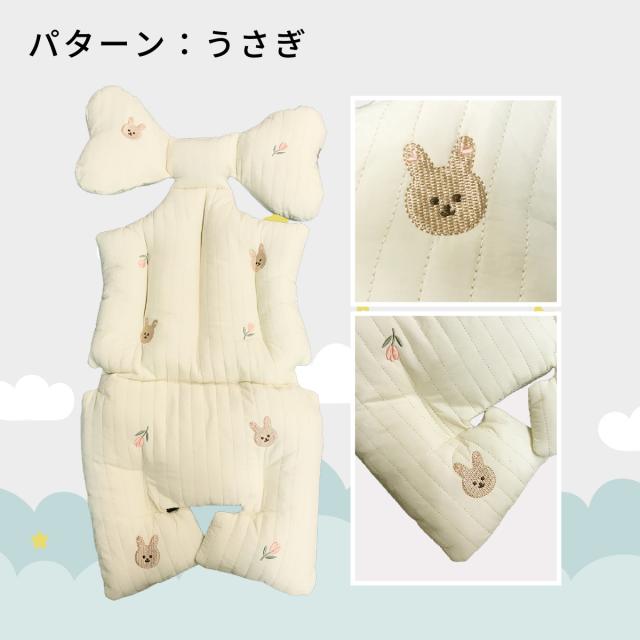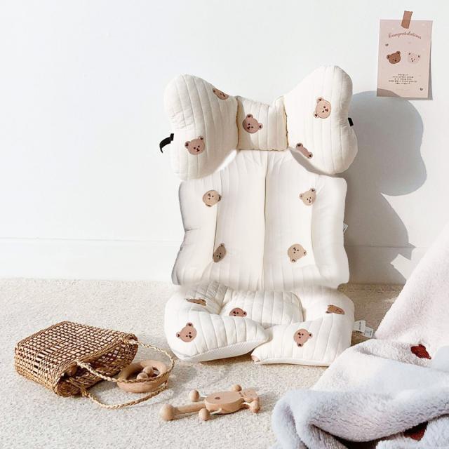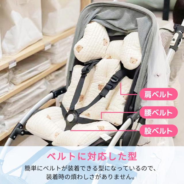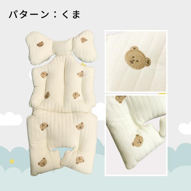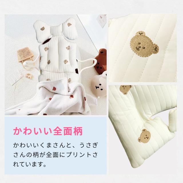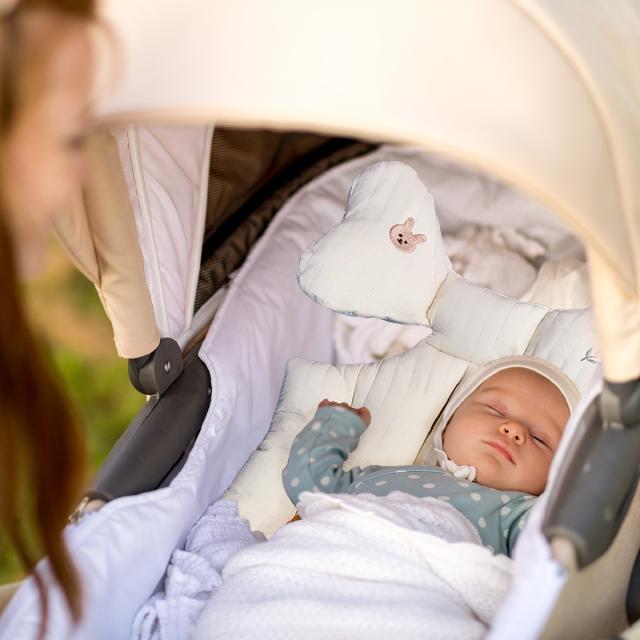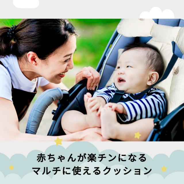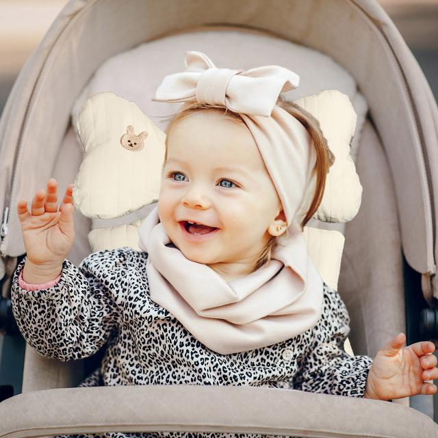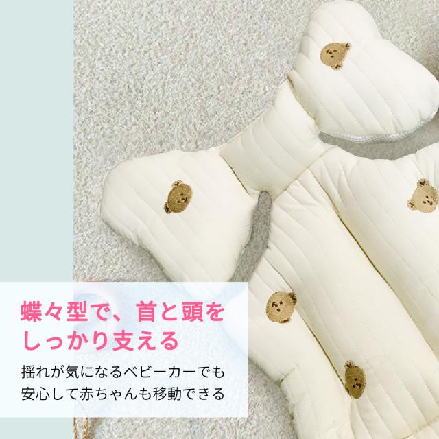 【蝶々型で、首と頭をしっかり支える】揺れが気になるベビーカーでも安心して赤ちゃんも移動できる。