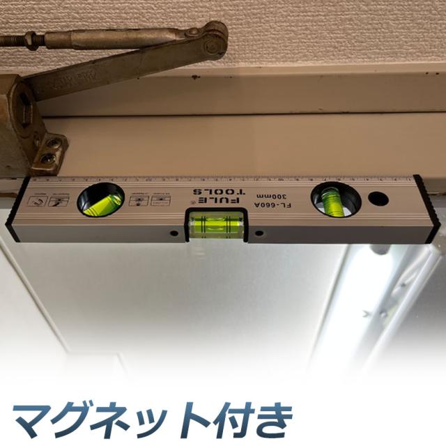 【 水平器 】 水平器は棚の取り付けや、レンガやブロックなどを積む際に地面に対して水平になっているかを確認するための道具です。水平ではない棚は危ないですし、レンガも途中で傾いて積むと見栄えが悪いだけでなく、修復の際も非常に面倒なことになります。そのため、水平器は「精度」が非常に重要です。本製品は耐久性の強いアルミ製を採用しているため、温度の影響受けにくい仕様となっております。また、そのほかにも変形しない・寿命が長いことが特徴となっております。
