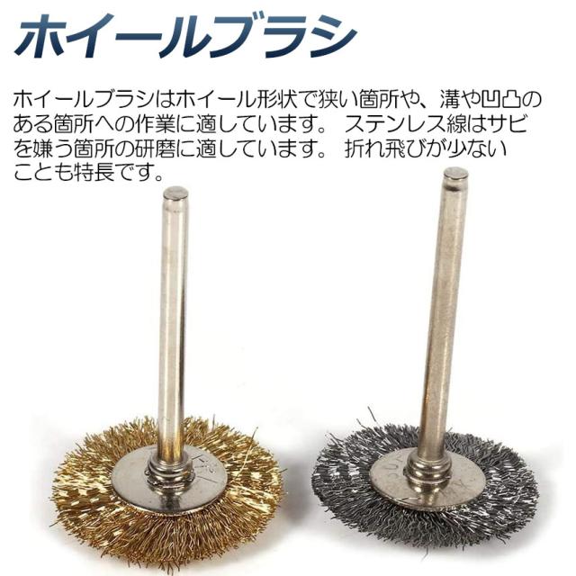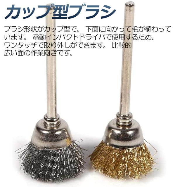 【ワイヤーブラシ36点セット】ホイールブラシ(軸径25mm)、カップ型ブラシ(軸径15mm)、筒型ブラシ(軸径6mm)の3種類。ホイールブラシはホイール形状で狭い箇所や、溝や凹凸のある箇所への作業に適しています。ステンレス線はサビを嫌う箇所の研磨に適しています。折れ飛びが少ないことも特長です。筒型形状により狭い範囲の作業に便利です。ブラシ形状がカップ型で、下面に向かって毛が植わっています。電動インパクトドライバで使用するため、ワンタッチで取り外しができます。比較的広い面の作業向きです。