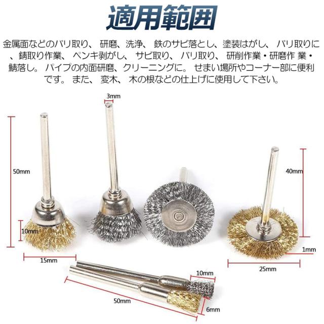 【適用範囲】金属面などのバリ取り、研磨、洗浄、鉄のサビ落とし、塗装はがし、バリ取りに、錆取り作業、ペンキ剥がし、サビ取り、バリ取り、研削作業・研磨作業・錆落し。パイプの内面研磨、クリーニングに。せまい場所やコーナー部に便利です。また、変木、木の根などの仕上げに使用して下さい。