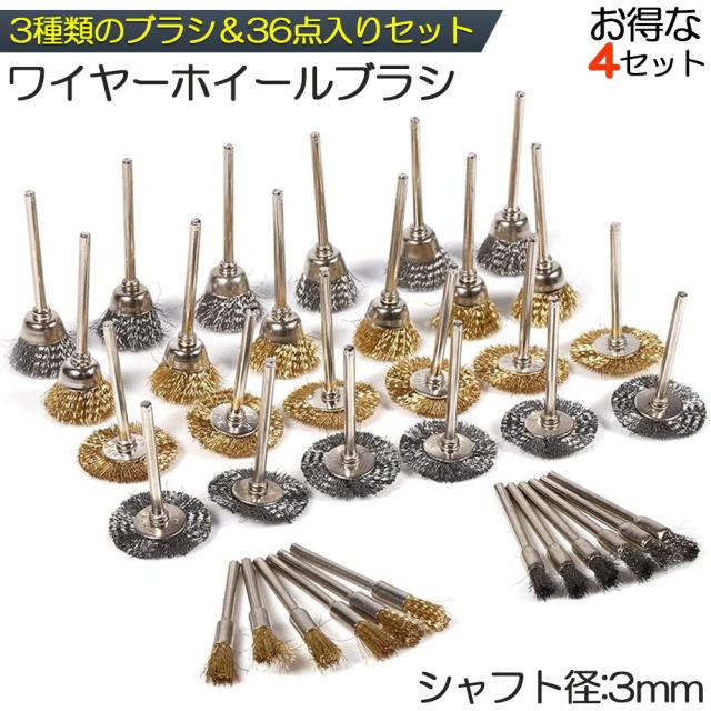 ワイヤーブラシ 4個セット 小型電動ワイヤーブラシ ホイールブラシ 研磨ブラシ 研磨ホイール サビ取り ルーター ワイヤーブラシ 3種類 36点入り ホイールワイヤー エンドワイヤー サビ落とし 塗装はがし研削 研磨 工具 DIY 工業用 ブラシ 工業用