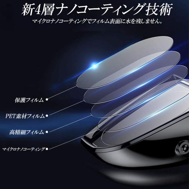 【安全運転確保】高い光透過率を持つPET素材 と最新4層ナノコーティング技術を採用したフィルムは高光透過率、防曇性、防眩性、防水性、防雨性があり、雨や霧の天候でも水滴が付着するのを防ぎ視界をクリアに保ち、またハイビームなど車のライトの眩しさも軽減でき、安心して快適運転ができる。