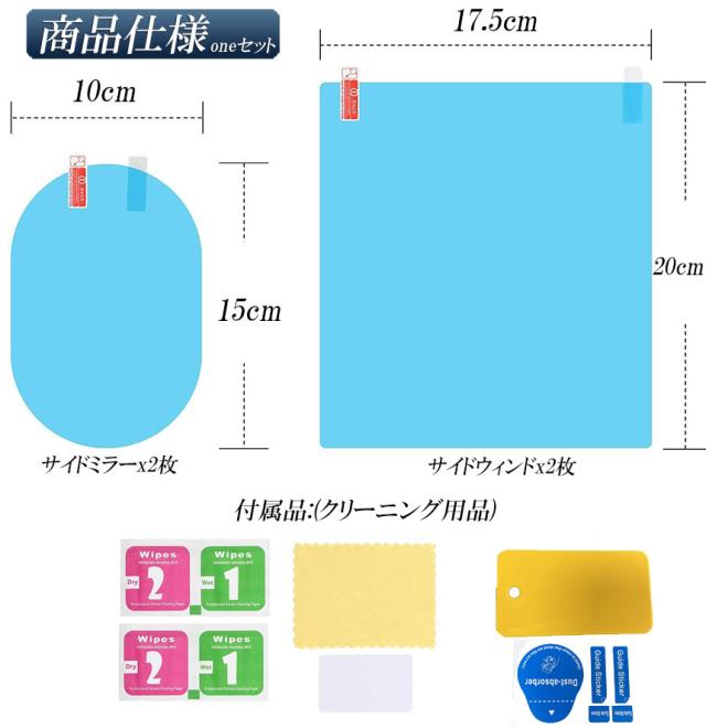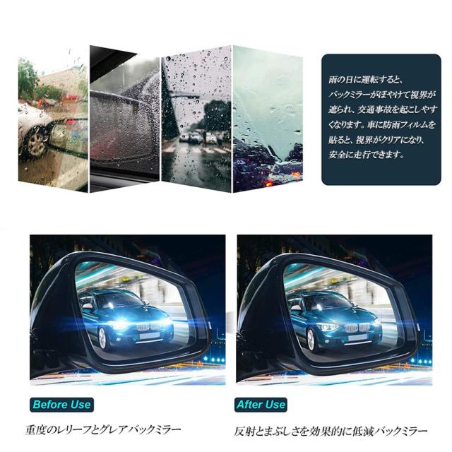 【用途】撥水・防水効果のある商品です。 大雨や気温低下による、曇り止め効果もあります。本製品を貼り付けるだけで、雨や雪でもドアミラーがはっきり見えるようになります! 安全に運転できますよ。