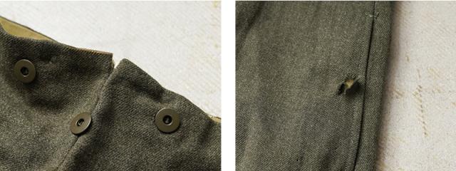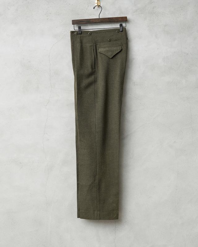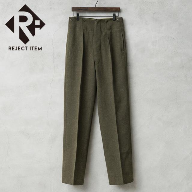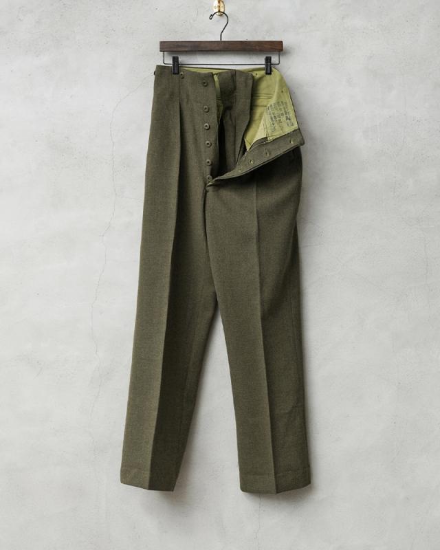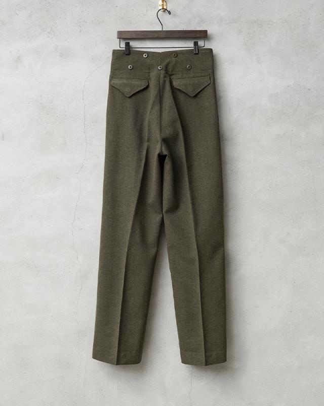 | 商品説明 | リジェクト 訳あり品 実物 新品 デッドストック カナダ軍 BATTLE DRESS(バトルドレス)ウール トラウザーズ CADET MODELのご紹介です。 1950年代を中心に使用されていたカナダ軍のヴィンテージトラウザーズが入荷しました!肉厚なウール素材が使用された上質なトラウザーズで、カナダ軍の士官候補生が使用していた歴史を感じさせる1本です。 BATTLE DRESS(バトルドレス)は第2次世界大戦の開戦直前にイギリス陸軍に導入され、1960年代まで着用されていました。イギリス軍より得られたデザインから様々な国でも採用され、各国独自のバリエーションのバトルドレスが導入されていました。 フロントはボタンフライ仕様で、サスペンダーボタンなど全体にドーナツ型のメタルボタンが使用された贅沢な仕様です。ウエストにはサスペンダーボタンが付属していますのでサスペンダーで吊り下げてトラディショナルなスタイルをお楽しみいただけます。 肉厚で紡毛された綾織りのウール素材が使用されており、両サイドのスラッシュポケット、バックポケットはボタン留めのフラップポケットが2箇所付属しています。適度にワイドで綺麗なストレートシルエットで、裾のストラップとボタンで裾のシルエットを調節することもできる仕様になっています。 多少ブラウンが混ざったようなオリーブが年代物の雰囲気を感じさせる品の良い色目で、ウール素材のパンツは保温性に優れており、抗菌・防臭効果もある素材です。センタークリースを備えることで縦にまっすぐ伸びたラインが強調され、上品さが際立ちます。 こちらは長期保管時に生じたホツレや破れなど不具合のある商品を選別しております。多少のリペアを施していただいてからの着用、もしくはリメイク資材としてもおすすめです。ファーストクオリティの品質を強くお求めの方は念の為ご購入をお控え願いますようお願い致します。 | ||||||||||||||||||||||||||||||||||||||||||||||||||||||||||||||||||||||||||||||||||||||||||||||||||||||
