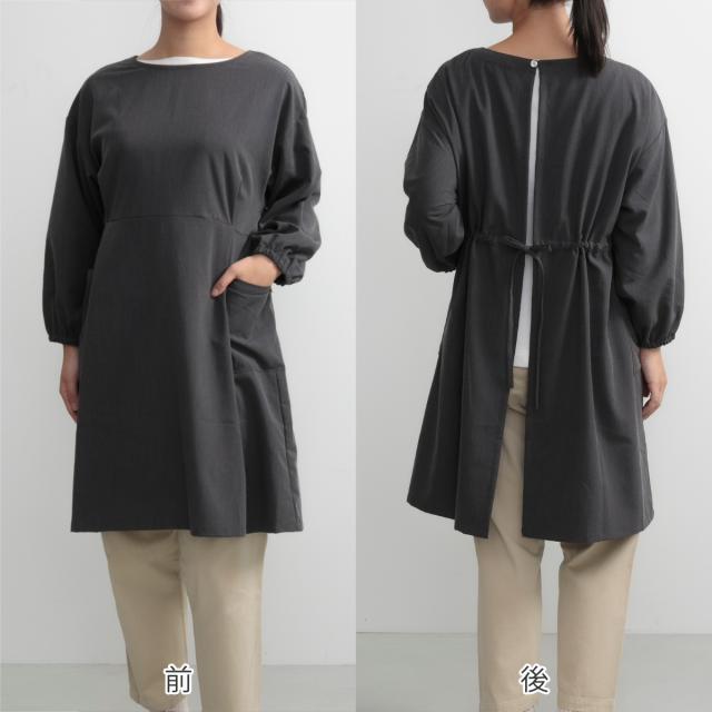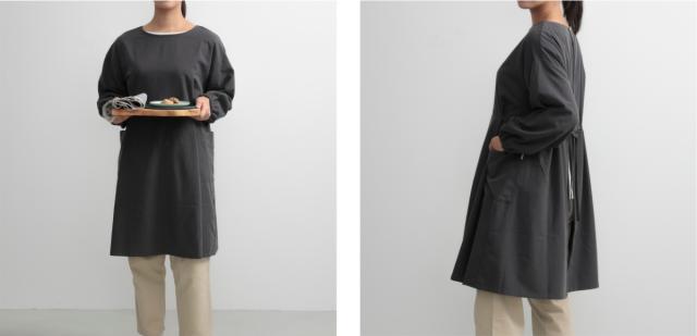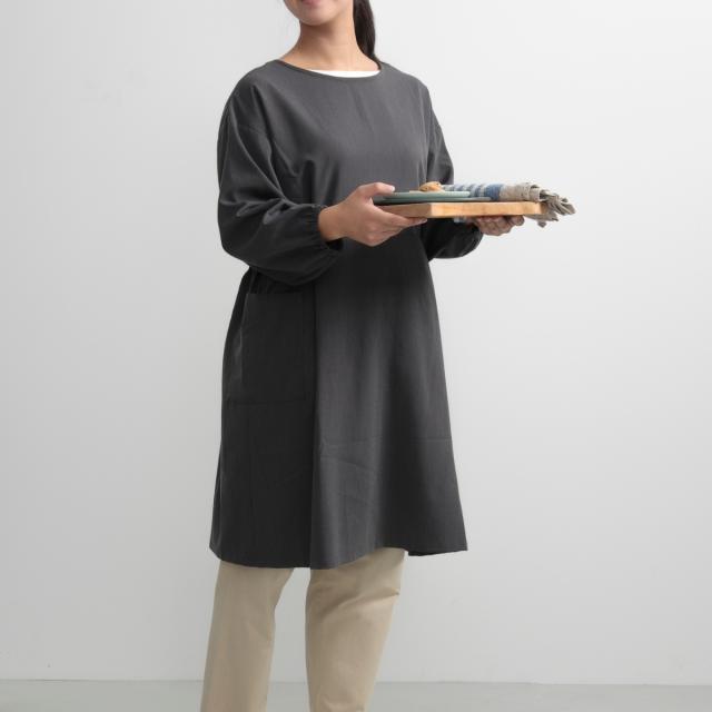 衣類の袖までカバーし汚れからガードできる、ミドル丈割烹着です。シックでおしゃれなデザインが日常に馴染み、着やすく、スタイリッシュに家事をこなせます。