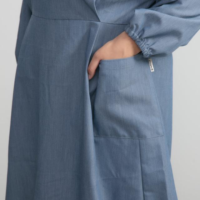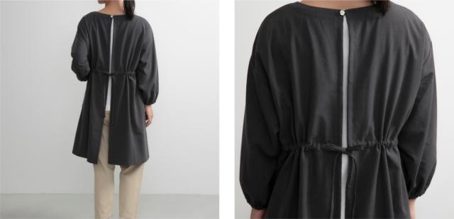 バックはリボンで結ぶ仕様です。ウエストをキュッと絞ってスタイリッシュに。また首元のボタンも華奢ですっきりとした印象です。