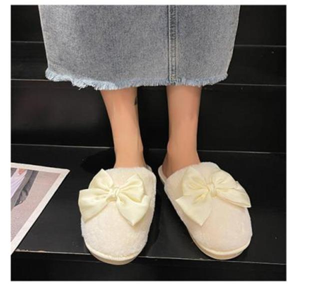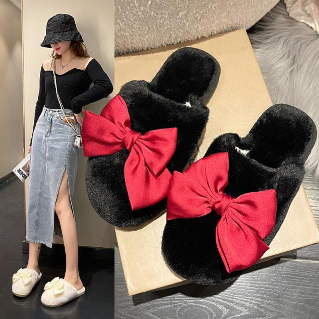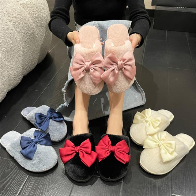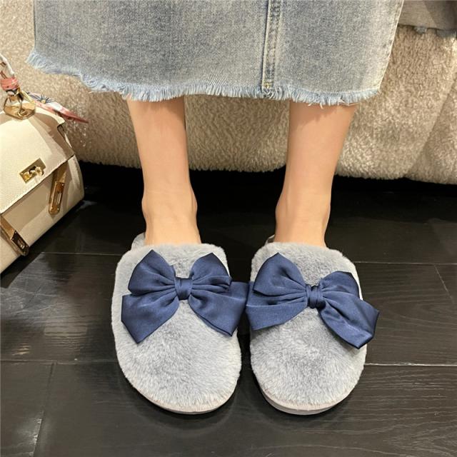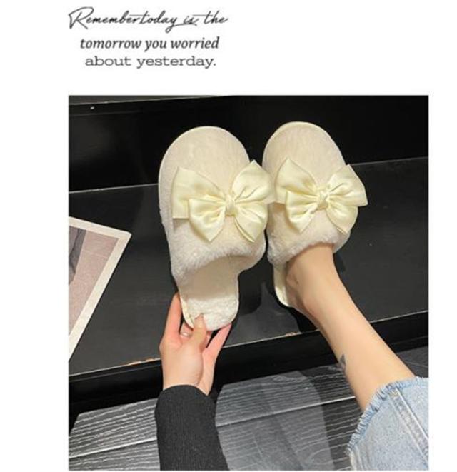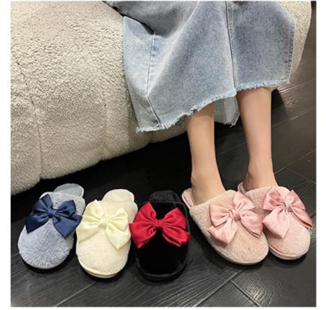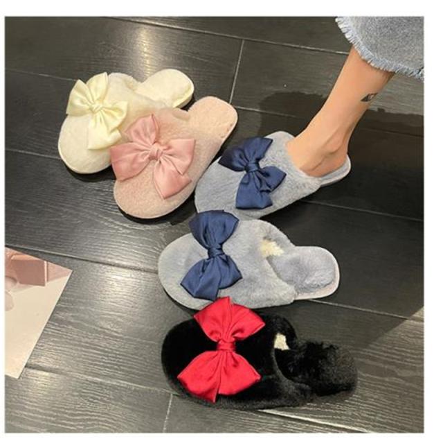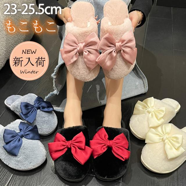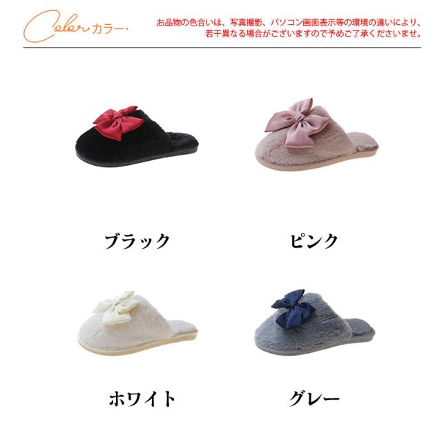 スリッパ レディース ルームシューズ ファースリッパ もこもこ 靴 シューズ ぺたんこ フェイクファー リボン 蝶結び 防寒 暖か