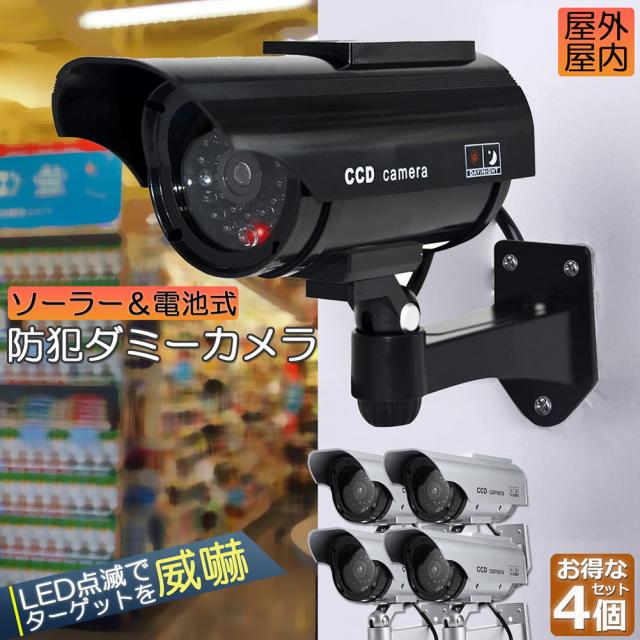 ダミーカメラ ソーラー パネル搭載 4個セット 屋外 玄関 屋内 防犯カメラ 赤LED常時点滅 防水 屋内外両用 監視カメラ ダミー 赤外線型 防犯対策