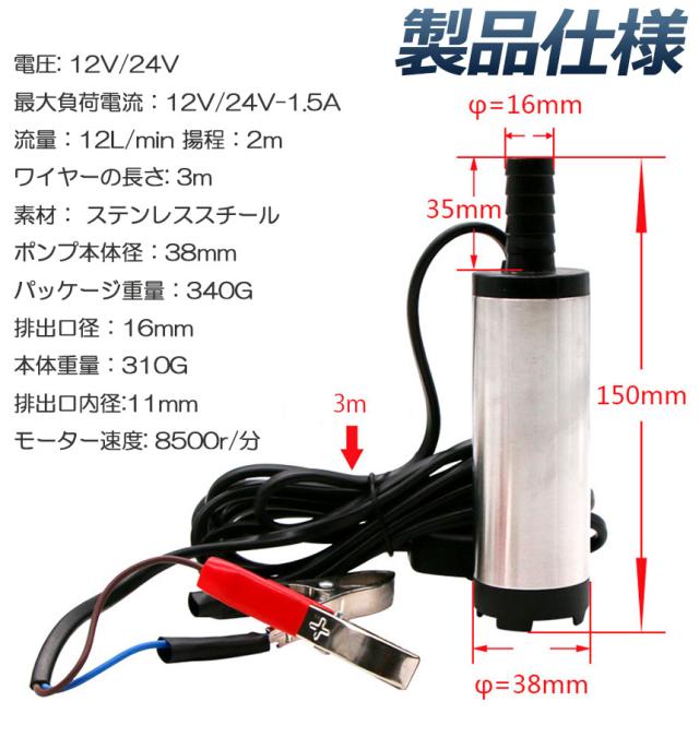 【商品仕様】:ON/OFFスイッチ付き 高さ:約16cm ポンプ直径:約38mm 吐出口径:約16mm ケーブル全長:約3m 吐出量:約12L/min 揚程:2m 電圧:DC12V&24V 電流:1.5A 接続方式:クランプ(ワニ口クリップ) 材質:ステンレス 適用範囲:ディーゼル、水、灯油、オイル等