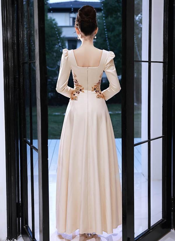 【送料無料】ドレス 大人 ピアノ 発表会 ロングドレス 演奏会 結婚式 母親 ドレス ピアノ発表会 シャンパン 袖付き ワンピース 長袖 演奏会ドレス
