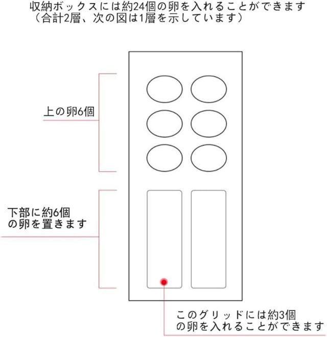 【容量】:24個の卵容器が2段階に分かれており、上下にそれぞれ12個の卵を収納できます。お手入れが簡単。全体的に掃除ができ、収納も快適です。透明なグリッドを引き抜くと、卵の数を確認したり、いつでも補充したりするのに便利です。