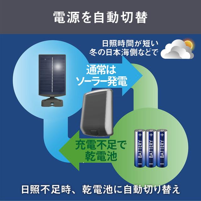 自動的に乾電池から電源供給しソーラー式ながら安定した点灯を実現した製品です。