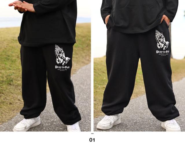 左右の掌を合わせて合掌し、神に祈りを捧げる「Praying Hands/祈り手」をドロップした、バギータイプのスウェットロングパンツ。